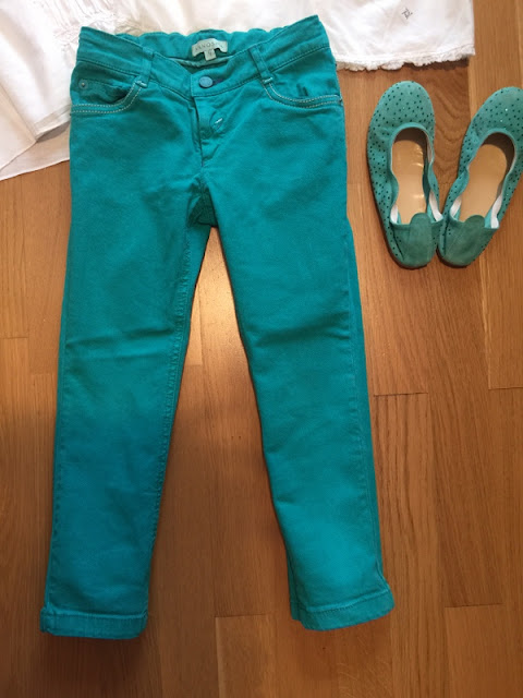 Talla: 4/5 años (chaqueta: 33,5cm de sisa y 35cm de largo; pantalón: cintura ajustable y 60.50 cm de largo) y Nº29 bailarinas